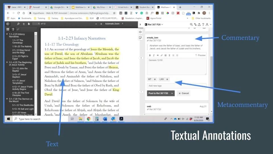 This research project has two overlapping components: (1) a collaborative study of the Gospel of Matthew using Hypothes.is, a collaborative asynchronous text annotation platform and (2) short video presentations on topics in and sources of Second Temple Judaism. The goal was to produce a free and open-access resource for academics, citizen-scholars, and religious leaders around the globe to understand the Gospel of Matthew in the context of first-century CE Judaism.